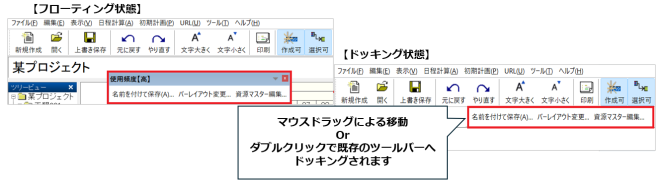 ドッキング状態にするには、ツールバーを画面上部までドラッグするか、ツールバーの名前部分をダブルクリックします。