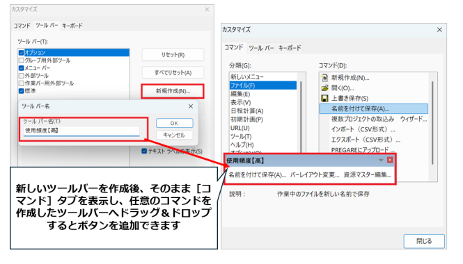 ③選択したコマンドをドラッグし、ツールバー上の任意の位置でドロップします。