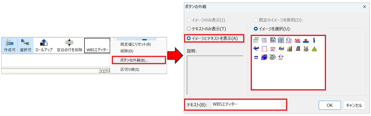 ③[ボタンの外観]にて、ボタンに表示するテキストとイメージを設定できます。