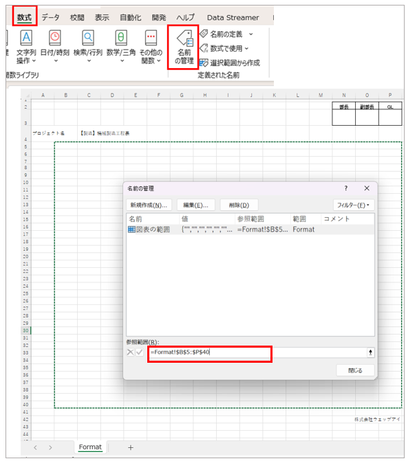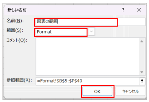 ③名前「図表の範囲」と入力、範囲「Format」を選択して「OK」をクリックします。
