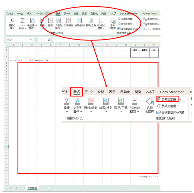 ②工程表を印刷したい範囲のセルを選択して、[数式]>[名前の定義]をクリックします。