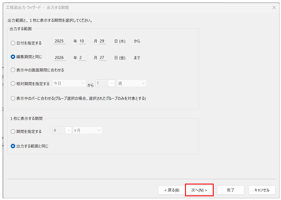 ⑥出力する期間の設定を必要に応じて行い[次へ]ボタンをクリックします。
