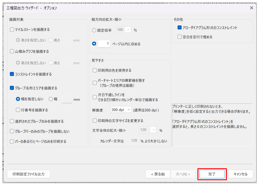 ⑦ 出力オプションの設定を必要に応じて行い[完了]ボタンをクリックします。