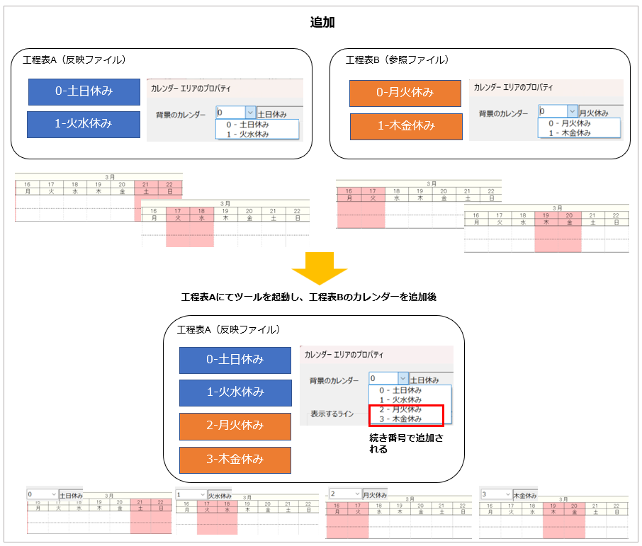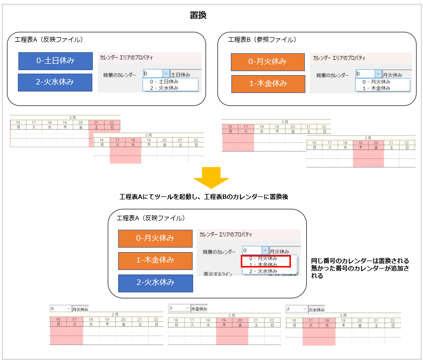 2つの工程'sファイルの間で、同じカレンダー番号のカレンダーデータを置換し、存在しないカレンダー番号のカレンダーデータを追加(カレンダー番号は保持)し、カレンダーデータを上書きします。
