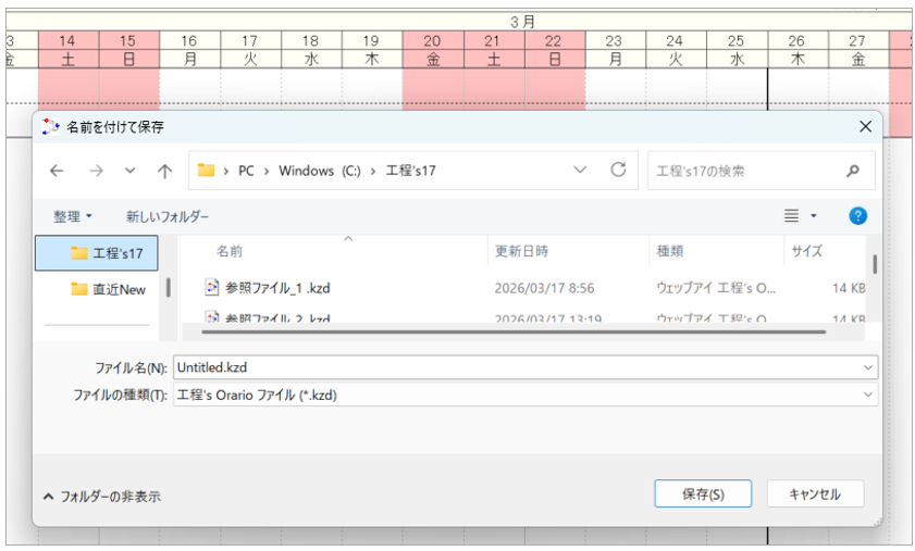 ファイルの種類を「工程's Oraio ファイル(*.kzd)」にして保存いただくことで、通常の工程表ファイルとして
