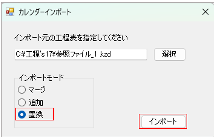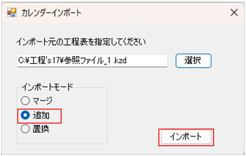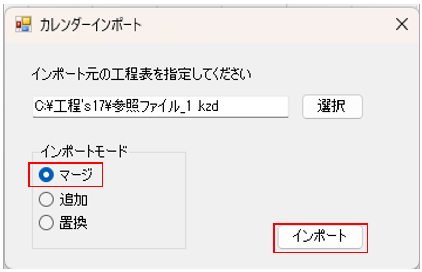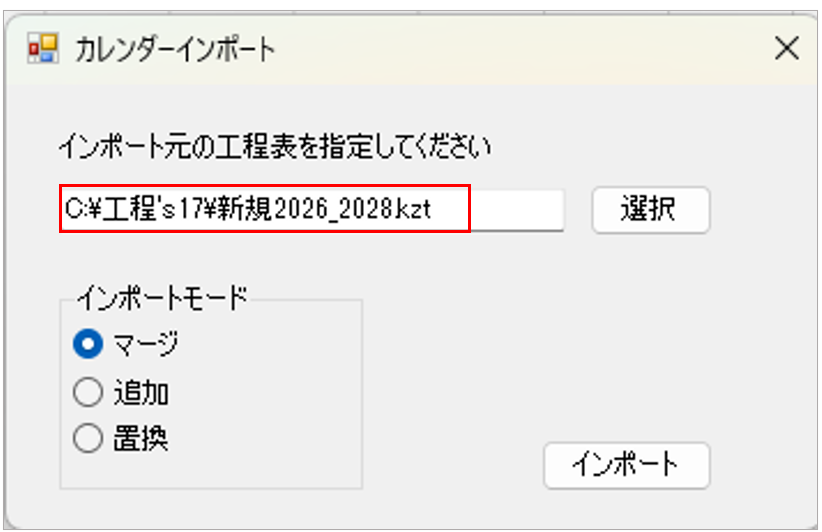 ツールメニューからカレンダーインポートツールを起動後、「選択」ボタンを選択し、マージしたい工程'sファイルを指定します。