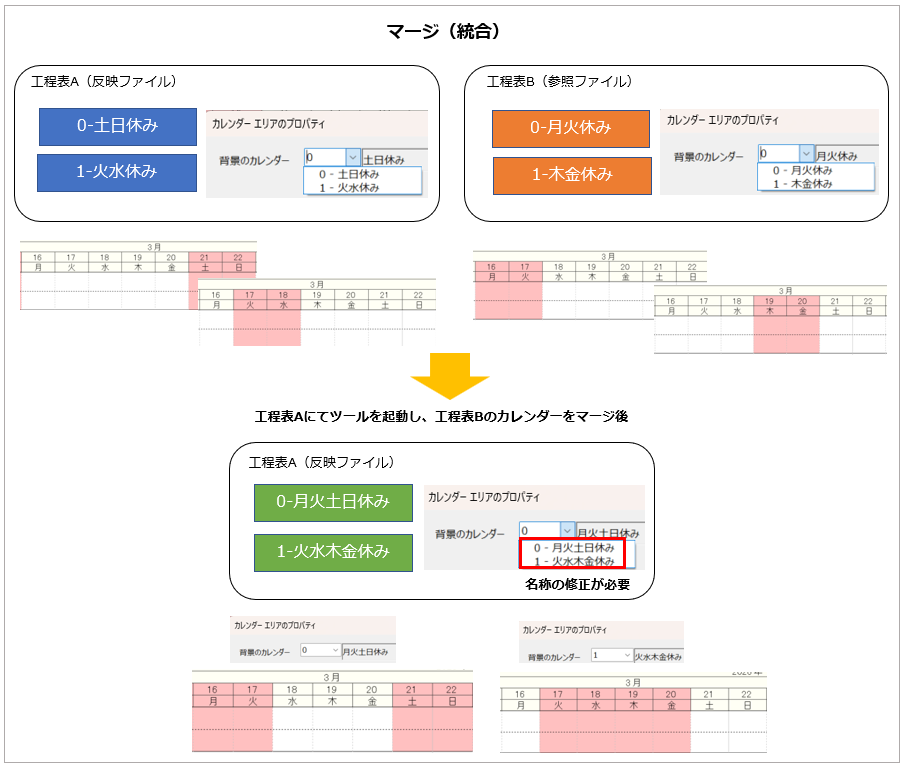 2つの工程'sファイル間で、同じカレンダー番号の休日を合算してカレンダーデータを上書きします。