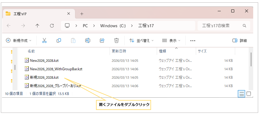 ①エクスプローラー上でダウンロードして展開したテンプレートファイル(拡張子.kzt)をダブルクリックします。