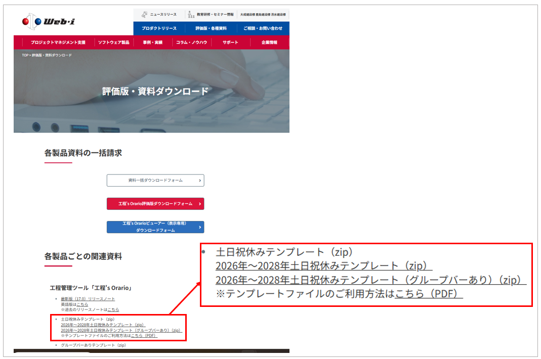 下記のダウンロードページにて2026年~2028年までの休日情報(土日と国民の祝日・振替休日)を登録した工程'sテンプレートファイルをダウンロードしていただけます。