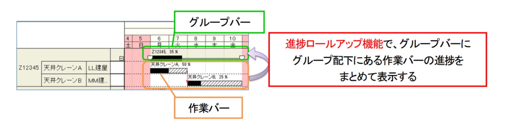 | ◆Tips 中日程としてグループバーのみ表示したときも工程’s が計算して進捗表示できるので便利です。 |