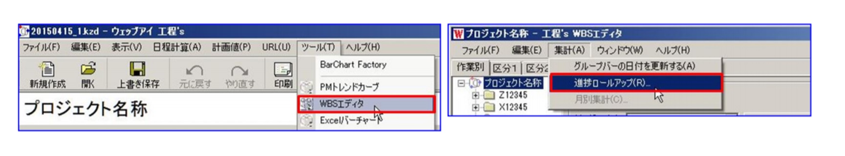 WBS エディタ画面が開いたら、[集計]メニュー > [進捗ロールアップ]をクリックします。