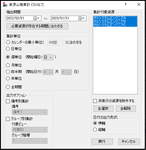 工程'sの資源山積み情報を指定条件で集計を行い、CSV データとして出力することができるツールです。