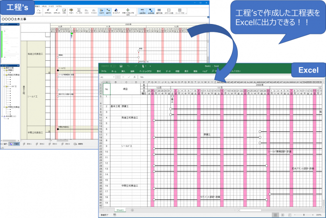 工程表と共にExcelの表計算機能を利用してレポートを作成したい場合に便利です。