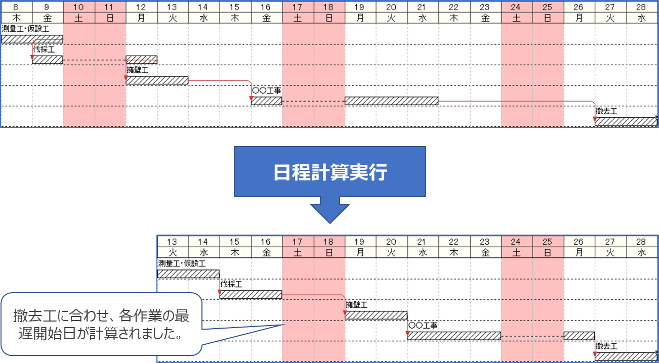 日程計算を実行することで、現在日を基準として、各作業の所要期間、コンストレイント、カレンダー情報を考慮しながら、最新バーを再配置することができます。
